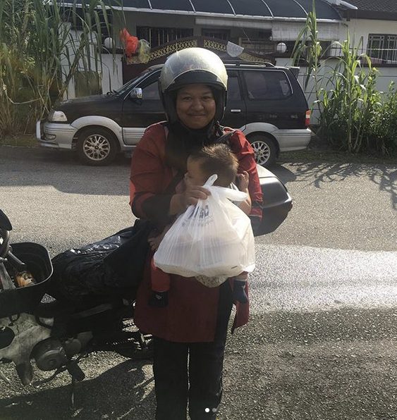 Tulisnya, “Pagi tadi order karipap. Terkejut tengok bila yang datang seorang ibu bermotosikal dengan anak kecil di depan yang nyenyak tidur.”