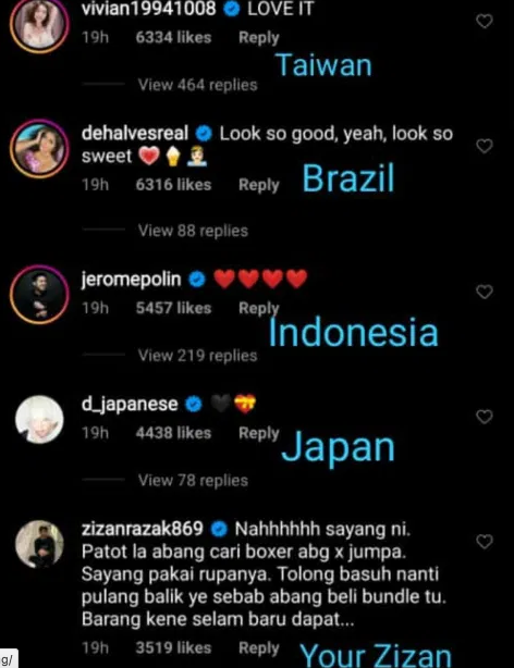 Pelakon dan pelawak terkenal, Zizan Razak tidak ketinggalan meninggalkan komen menerusi entri tersebut dengan menulis, “Nahhhh sayang ni. Patut la abang cari boxer abang tak jumpa. Sayang pakai rupanya. Tolong basuh nanti pulang balik ye sebab abang beli bundle tu. Barang kena selam baru dapat.”