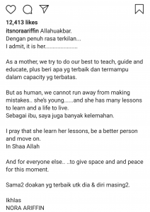“Allahuakbar, dengan penuh rasa terkilan.. saya mengaku, memang dia..sebagai seorang ibu, kita telah mencuba paling terbaik untuk mengajar, mendidik dan berikan apa yang terbaik dalam termampu dalam kapasiti terbatas.