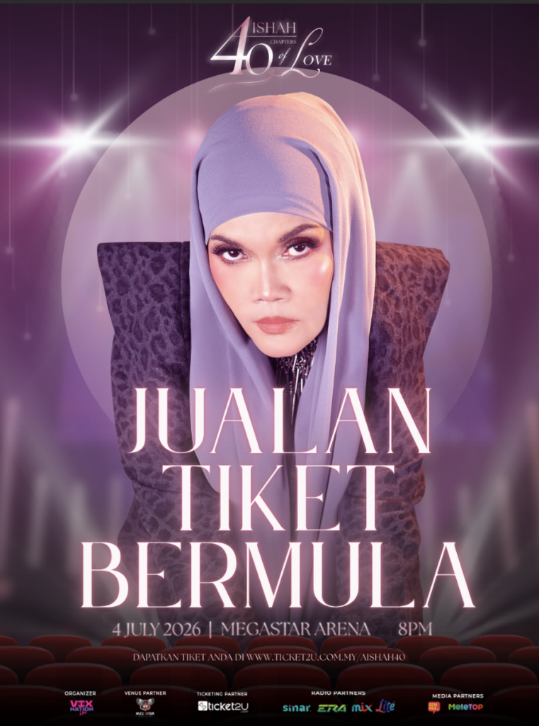 Tiket bagi konsert “Aishah 40 Chapters of Love” akan mula dijual pada 17 April 2026, jam 3.00 petang melalui laman web http://www.ticket2u.com.my/Aishah40